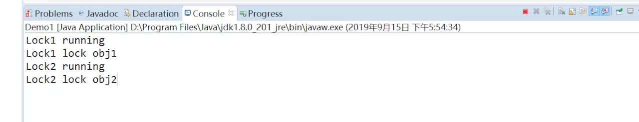package com.MyMineBug.demoRun.test;public class Demo1 { public static String obj1 = "obj1"; public static String obj2 = "obj2"; public static void main(String[] args) { Thread a = new Thread(new Lock1()); Thread b = new Thread(new Lock2()); a.start(); b.start(); }} class Lock1 implements Runnable { @Override public void run() { try { System.out.println("Lock1 running"); while (true) { synchronized (Demo1.obj1) { System.out.println("Lock1 lock obj1"); Thread.sleep(3000);// 获取obj1后先等一会儿,让Lock2有足够的时间锁住obj2 synchronized (Demo1.obj2) { System.out.println("Lock1 lock obj2"); } } } } catch (Exception e) { e.printStackTrace(); } } } class Lock2 implements Runnable { @Override public void run() { try { System.out.println("Lock2 running"); while (true) { synchronized (Demo1.obj2) { System.out.println("Lock2 lock obj2"); Thread.sleep(3000); synchronized (Demo1.obj1) { System.out.println("Lock2 lock obj1"); } } } } catch (Exception e) { e.printStackTrace(); } } } 运行结果如下: